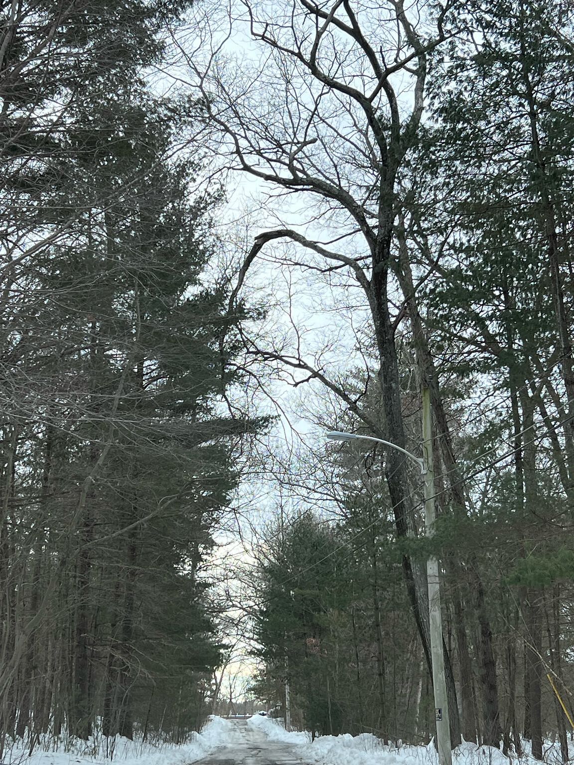 Large tree limb is broken, and hanging over public roadway. Danger of falling- pls address