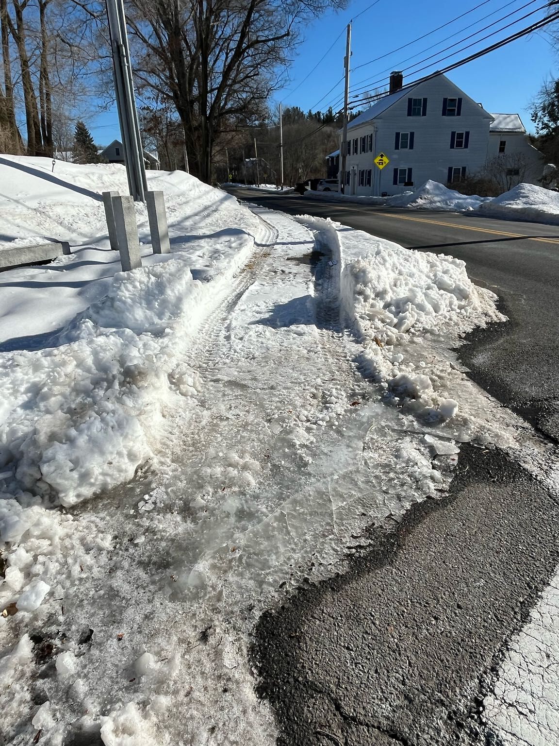Sidewalks and walkways along Nashua Road are still covered with snow and ice.