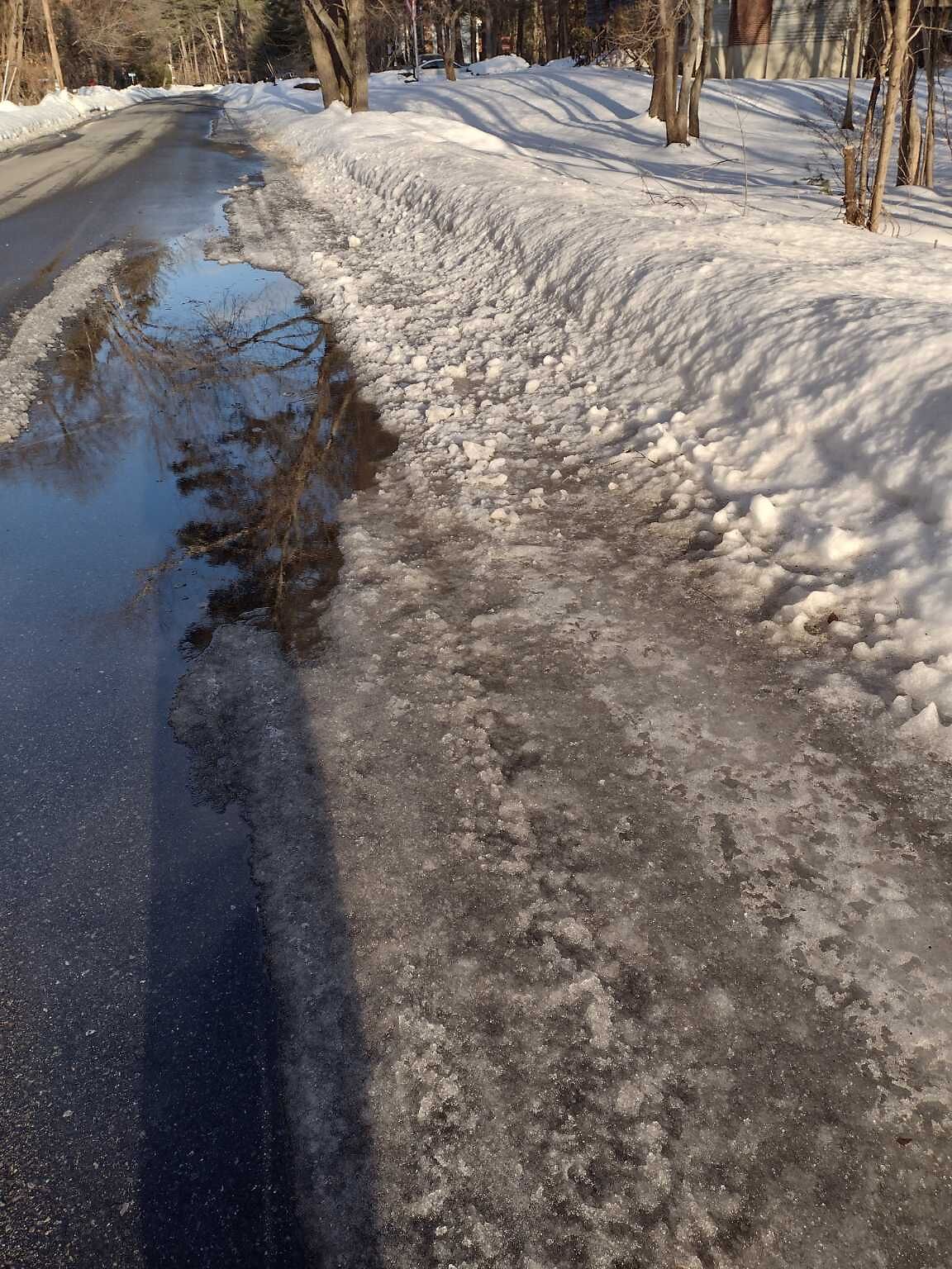 The water drain is blocked on the odd side of the street between house 13 & 15. The street and side bank are all ice covered.