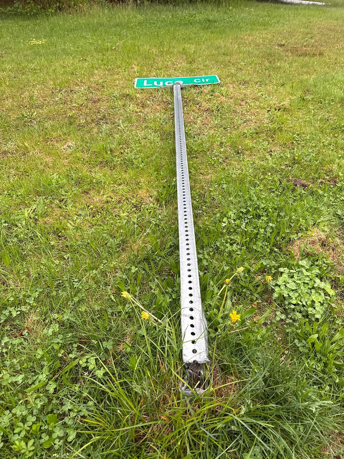 The sign is laying on the ground because the pole totally broke