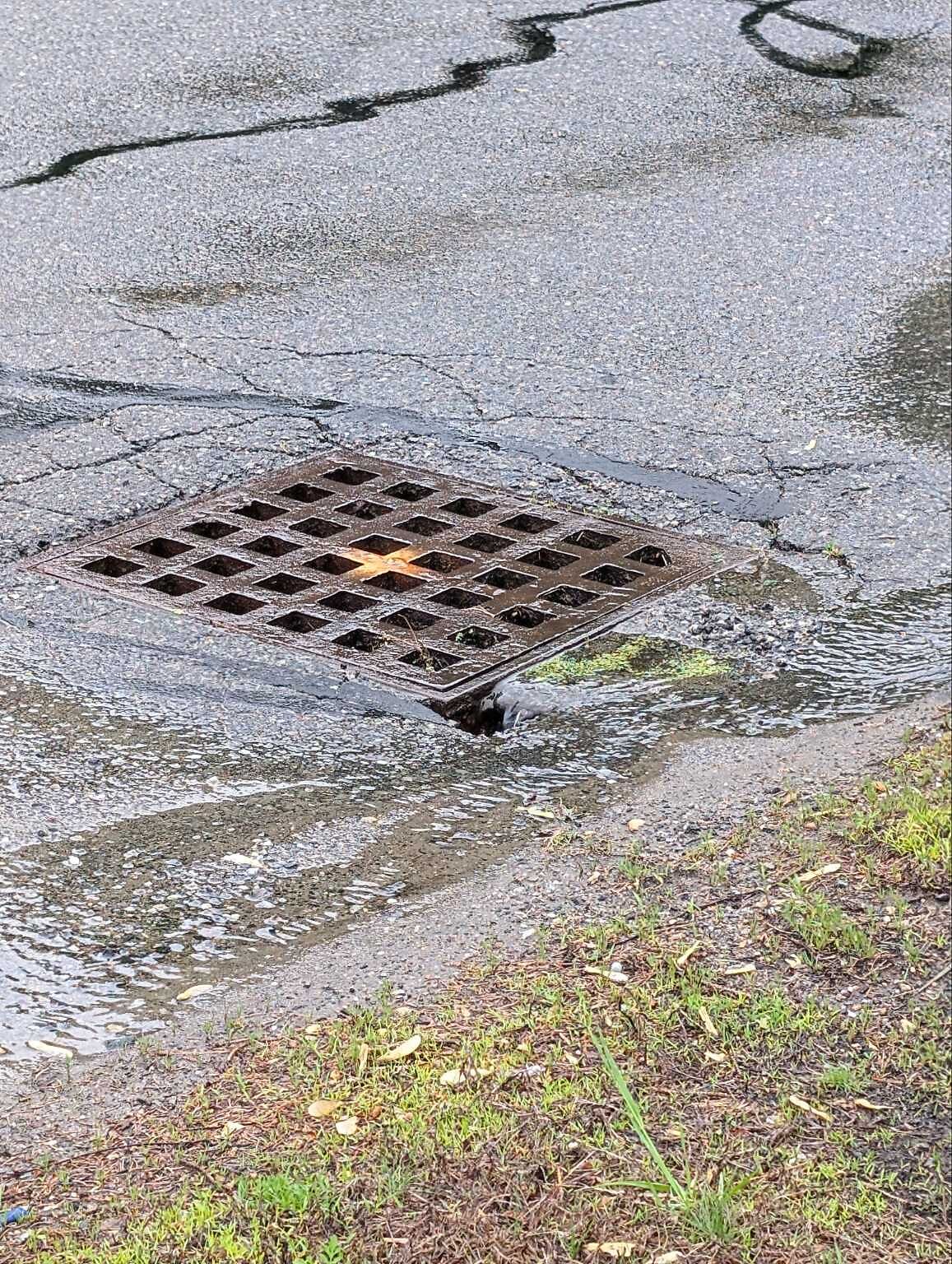 Pothole opening next to storm drain in front of location. Water is flowing into the pothole instead of storm drain