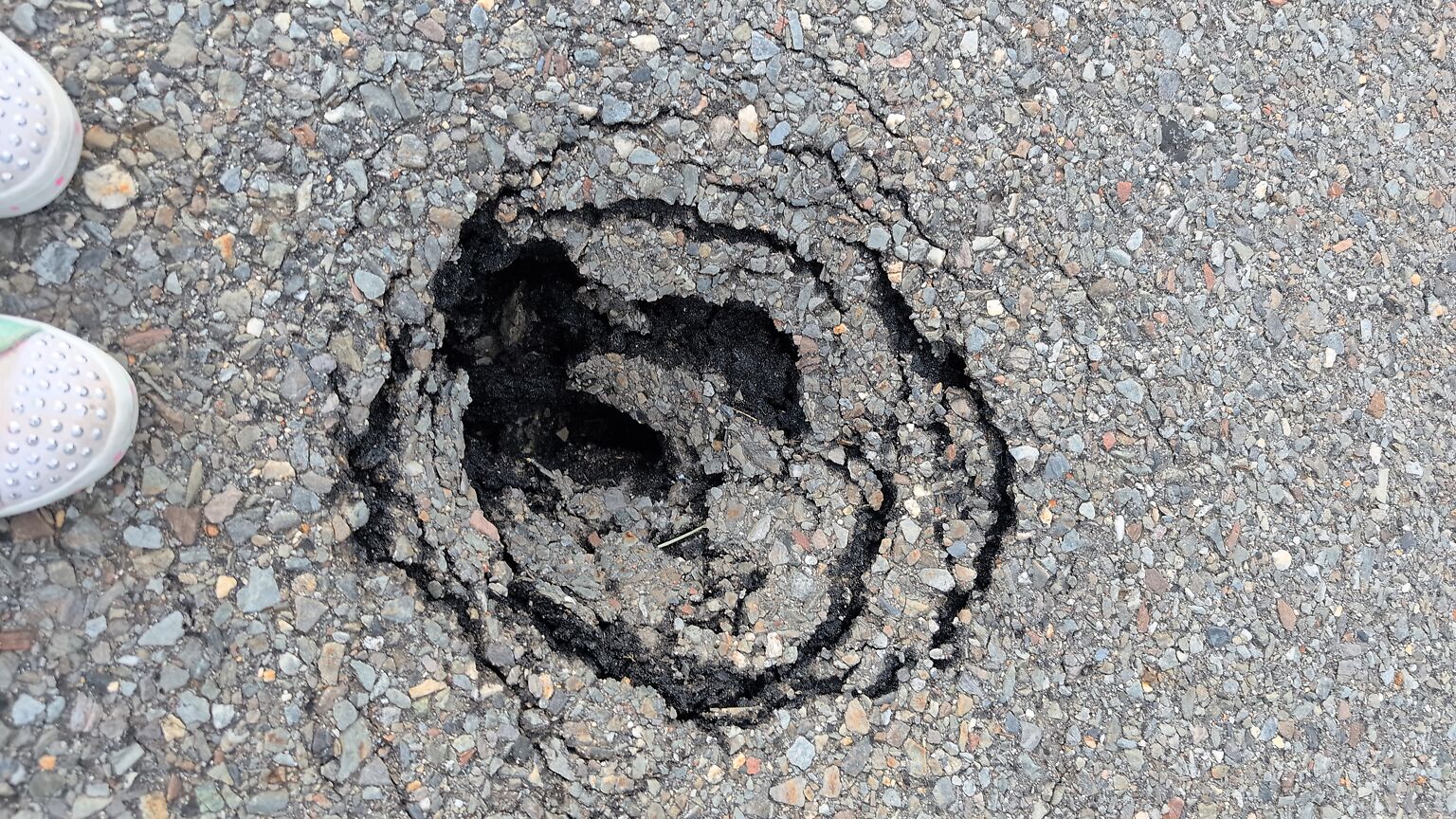 Looks like a sink hole forming. There is a sewer drain on either side of the road in line with this hole. It's diameter is about 1ft. Sinks down about a foot and goes under the pavement above at edges