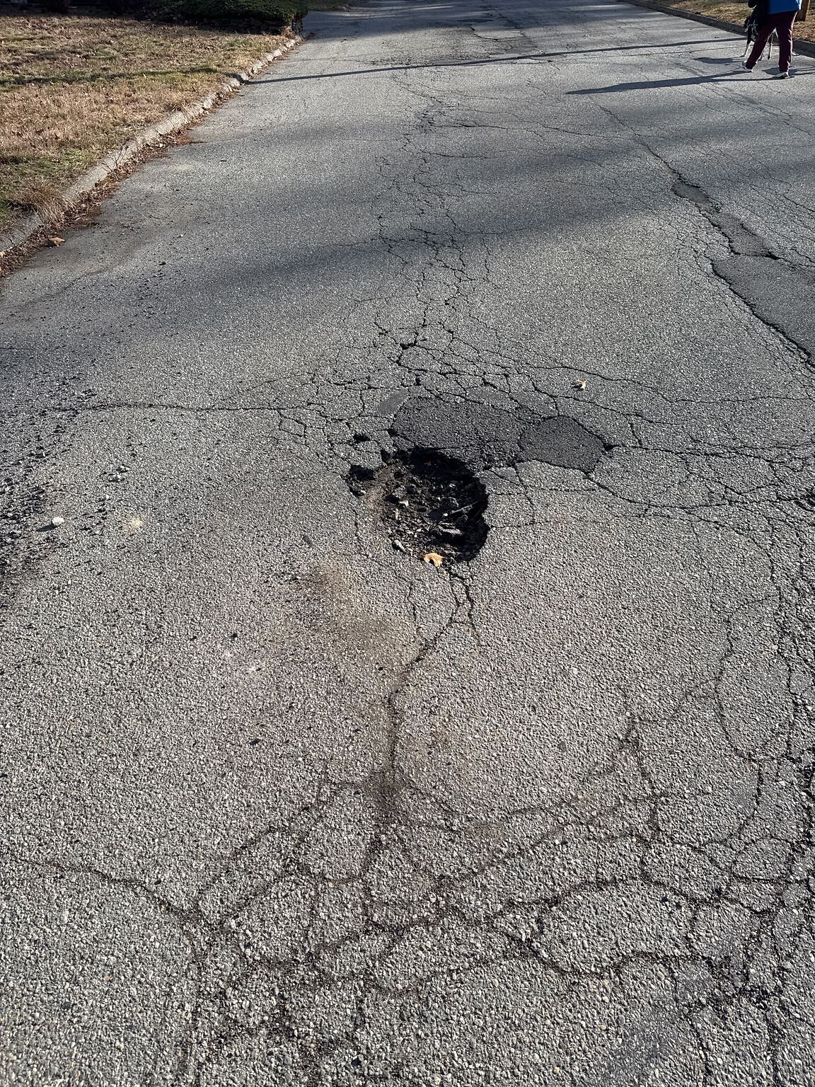 Pothole that has grown with recent rain and cold.