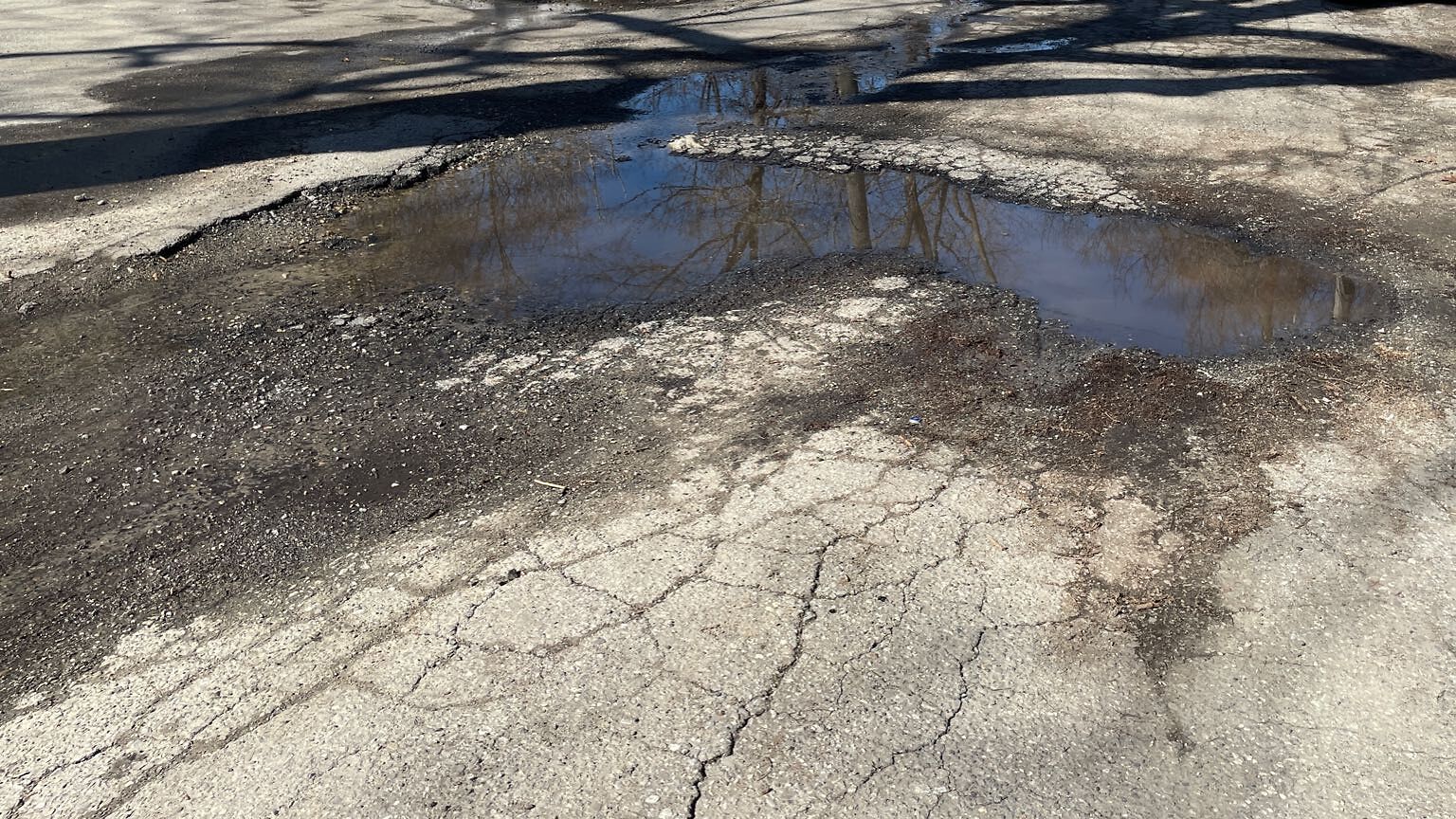 Massive growing pothole from plow trucks ripping up pavement over the winter. End of Clinton St near the storm drain access cover.